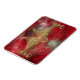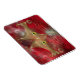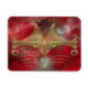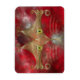 A stylized cat face made of glowing gold curves and curlicues, with wide green-gold eyes, against a red fractal background.