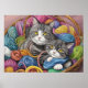 This poster captures a heartwarming scene featuring two adorable cats nestled in a cozy basket, surrounded by a tangle of colourful wool.