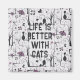 A cute and fun pattern for the cat lover in your life. The design features cat silhouettes in black, trees, flowers, birds and moths all in a graphic style on a platinum white background. And the text: Life is better with cats which you can change to add your own personal touch