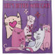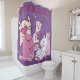 A purple shower curtain with pink text that reads Life's Better With Cats and features lots of adorable cartoon cats, hearts, and butterflies in shades of pink and lilac.