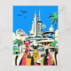 Postcard in an illustration of three stylish, cats dressed as tourists standing before a futuristic cityscape. The architecture evokes mid-century sci-fi aesthetics. The cats hold cameras, maps, and wear lanyards, suggesting adventure. Palm trees and a bright blue sky enhance the vacation atmosphere.