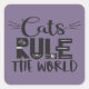 Fun and lovely modern purple sticker featuring the words "Cats rule the world", decorated with white whiskers, cat scratches, a tiny mouse, and a little paw.