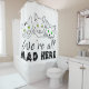 We're All Mad Here text and drawing of three funny cat faces with yellow and green eyes. Funny t-shirts, prints and gifts for fun and good mood. Shower curtain to decorate your bathroom for fun and good mood.