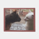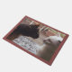 The sweet design on this Doormat is an original photograph by ZoeSPEAK, of two cats greeting each other in a doorway. One of the cats is a calico, with black, orange and white mixed colouring and one orange ear tip. The other cat has white fur, blue eyes and a pink nose. Through a screen door we can see a welcome mat on the wooden deck, with the word "WELCOME" facing outward from the doorway. A terracotta planter with greens and some white furniture complete the background.