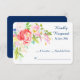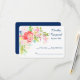 A bright and colourful floral and cattail bouquet is at the top left corner of this pretty wedding response card. Colours in the bouquet include coral pink, light violet pink, white, pale yellow and gold, and green, with a touch of aqua blue. Your custom text is at the right in blue. The image and text are placed on a white background to make it easy for your respondent to mark their choice. The back of the card is navy blue. This card matches invitations and other wedding products in our store.