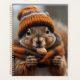 The design conveys a sense of coziness, warmth, and perhaps a touch of whimsy, making the squirrel look ready for colder weather as it snacks away contentedly on autumns surplus supply of nutrition. The background is softly blurred, with muted greens and browns.
