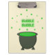 This awesome clipboard features a graphic image of a grey cauldron. The cauldron is full to the top with a green potion brewed by a witch. The potion is bubbling out of the cauldron and has formed the word "bubble" which appears twice above the poisonous looking brew.