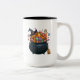 Cauldron De Giggle & Gummies Mug. Des poutres joyeux en chaudron, farcies de bonbons qui explosent comme des confettis, arborant fièrement un casquette sorcier. Son pote à balai se penche de près, attendant clairement le décollage à sucré, la plus belle sorcière d’Halloween !