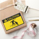 Yellow and black caution sign with a fish trying to eat a stick figure.