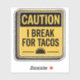 This bold, humourous sticker mimics a classic safety sign and proudly announces: “I BREAK FOR TACOS.” With a striking black top panel and yellow bottom, it features clean, all-caps typography and a minimalist black taco icon—perfect for taco enthusiasts with a sense of humour. The sticker’s sharp design and thick white-and-black border make it pop on any surface, from laptops and lunchboxes to bumpers and coolers. It's the perfect accessory for foodies who take taco time seriously.