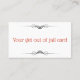 Cette carte est faite dans un style victorien avec garniture de défilement, et la main pointée en noir et blanc se positionnant directement au nom de votre nom d'entreprise de cautionnement. Il est écrit "Allez directement aux obligations sous caution ( votre nom d'entreprise)". Pas directement en prison ; ) Sur le dos il dit "Votre carte de sortie de prison". Fait dans les couleurs rouge, noir et blanc et est entièrement personnalisable.