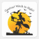 This fun sticker will be fun to use on Halloween gifts for the kids. It says "Caution! Witch in Flight" and there is a black silhouette against a full orange Harvest moon that shows a haunted house in the distance, a graveyard and a witch flying with her cat, up in the sky amongst the bats.