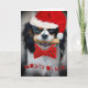 Tri Colour Cavalier King Charles Spaniel wearing a Santa hat and holiday bowtie and holding an oversized dog biscuit in his month is a fun Christmas card perfect greeting for a log lover.
