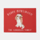 Adorable Christmas doormat featuring a Cavalier King Charles Spaniel Dog wearing a santa hat on a festive red background.