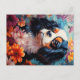 A close-up portrait of a tricolor Cavalier King Charles Spaniel puppy, rendered in a painterly style. The dog has a white, black  and brown coat, with large, expressive brown eyes. It is surrounded by a profusion of colorfull flowers, creating a soft and romantic atmosphere. The dog's fur is depicted with meticulous detail, capturing the texture and flow of its long, silky hair. Perfect gift for cavie lovers.