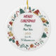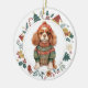 This cute Holiday ornament features a watercolor image of an adorable red and white Cavalier King Charles Spaniel puppy dressed in his winter sweater and hat. The image is framed within a colourful circle wreath made up of various Holiday images, including a snowman, bells, candy cane, stocking, holly, and more! The back of the ornament has the same wreath image with your custom text in green, gold, and red. See more Spaniel designs at Dog Village.