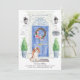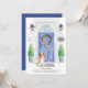 Announce your new address with our stylish announcement featuring a Cavalier King Charles Spaniel, blue front door, welcome mat, slate sign, topiaries and a floral wreath set on a grey brick background.
