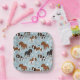 Cute Cavalier King Charles Spaniel with black, brown and white coats with scattered dog bones and pawprints pattern.