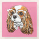 This design features a portrait of a Cavalier King Charles Spaniel wearing glasses and a bow tie on a pink background.