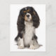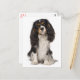This fun canine postcard features an image of a black, brown, and white Cavalier King Charles Spaniel puppy dog highlighted against a crisp white background.