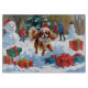 A cheerful Cavalier King Charles Spaniel runs through the snowy winter scene, wearing a festive red Christmas hat. This charming design highlights the breed’s silky ears, gentle nature, and playful personality while capturing the warmth and joy of the holiday season. A heartwarming winter moment full of festive cheer.