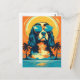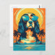 Colourful design of a Cavalier King Charles Spaniel wearing sunglasses at a tropical beach.