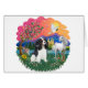 A golden castle on a hill overlooks a crystal blue river. On the other side a unicorn looks over at a tri coloured Cavalier King Charles Spaniel while a shy rabbit sniffs the clean, fresh air. A blue bird sings a happy song and a dove of peace flies over head.