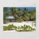 A small beach house nestled in the shade of the palm and seagrape trees on an idyllic white sand Caribbean beach in the Cayman Islands