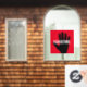 White text, black hand, red background.