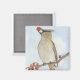 A tiny watercolor wildlife painting of a Cedar Waxwing exuberantly enjoying some red berries in the winter.