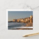 Postcard of the typical architecture of the old houses built on the beach of the Mediterranean Sea in the town of Cefalu, on the Island of Sicily in Italy with a fading bar and the text Cefalù.