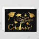 Celebratory mood expressed with flying graduation caps and popping champagne bottle. Black on gold. Personalize on the back with your text.