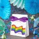 Ce Ballotin PRIDE THEMED a le drapeau LGBTQ. Sur le panneau avant et arrière, on peut lire "Célébrez !". Il y a une zone pour le texte personnalisé, sur le rabat avant. La vente de tente a quatre choix de couleur ruban (violet montré ici.)