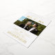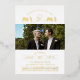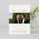 Gay sequel wedding invitation in white with golden fonts and your wedding photo. In an arch above gold foil mr and mr connected with intertwined hearts, celebrate with the new. Add your LGBT post wedding celebration details below and another wedding photo on the other side. White and gold foil gay wedding reception invitation in personalized with your wedding photos. Mr & Mr post elopement celebration invitation personalized with two photos.