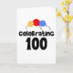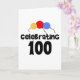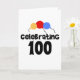 Three primary colours balloons and black text that reads "Celebrating 100" on 100th birthday cards, T-shirts, mugs, and more.