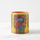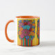 Vibrant Stylized painting of a colourful floral bouquet in a matching striped colourful vase by popular artist Lisa Lorenz on a stylish coffee mug.
