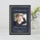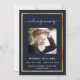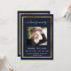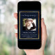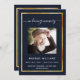 A dark blue background, a faux gold frame . Personalize and add a photo, name, dates and your text. White text.