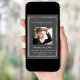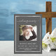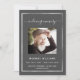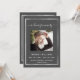 A dark grey background, a faux silver frame . Personalize and add a photo, name, dates and your text. White text.
