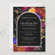 A Boho black arch provides the frame for your Celebration of Life details. The transparent edge makes it pop against the black background and Fall flowers. The elegant and traditional white text is easy to read and personalize. Fall flowers surround the Boho arch. Deep burgundy red roses, bright orange dahlias, purple pansies and dangling magenta fuchsia flowers create a dramatic vibe. The deceased person's name is written in a traditional script text. All of the text can be easily edited to create a personal remembrance.