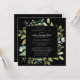 Elegant celebration of a life square invitation features a botanical frame of white berries and flowers and foliage on a black background. The deceased person's name is written in a traditional script text. All of the text can be easily edited to create a personal remembrance.