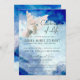Funeral memorial invitation featuring watercolor dove and blue clouds.