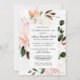 Elegant celebration of a life invitation features pink roses and lilies nestled in dark green foliage. The deceased person's name is written in a traditional script text. All of the text can be easily edited to create a personal remembrance.