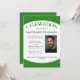 Green CELEBRATION OF LIFE Memorial Funeral Photo Invitation with PHOTO TEMPLATE and CUSTOMIZABLE text. There is a Christian Bible text based on 2 Corinthians 5:8 at the bottom which says ABSENT FROM THE BODY, PRESENT WITH THE LORD. The background text says IN LOVING MEMORY in a subtle tiled pattern. Other colours plus flag version available.