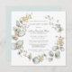 Elegant white flowers nestled among dusty blue botanical eucalyptus foliage form a carefree Boho wreath around your Celebration of a life details. The back is a soft dusty blue. All of the text can be easily edited to create a personal remembrance.