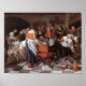 This painting is in the Wallace Collection in London. It shows a party to celebrate the arrival of a newborn baby. In the middle, a father holds his newborn. On the left, the mother lays in her bed (below the canopy on the top left). Friends and family surround the father and baby. The scene is chaotic but happy. People engage in all sorts of activities, and bowls, pans, plates, egg shells, and food are scattered throughout the room. In the foreground, a maid is shown from the back. She is dressed in happy colours and holds a red chair for the father to sit in. The woman standing on the right side (from our point of view) from the father will receive some money from the father who puts his left hand in a money bag. In the right foreground, a smiling woman is stirring in a large pot and holds up her hand to receive some money as well. Another woman helps her pouring sugar into the pot. The maid on the right is getting a sausage that hangs from the chimney. On the left, two people are paying attention to the mother, and one of them feeds her some soup. To the left of the table, a pregnant woman sits next to a crib. She holds a glass in her left hand and conceals her belly with a white apron.