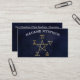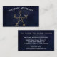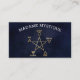 This custom business card features an elemental pentagram design with a celestial theme for psychics, wiccan practices, healers and other mystical storefronts. An image of a gold pentagram is pictured on the front, pointing to each of the five elements - earth, fire, water, spirit, and air. A sample psychic medium name is printed above the pentagram symbol. The back of the business card features the location and contact information. The background is a dark night sky filled with stars.