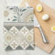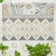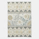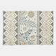 A seamless folk-art inspired pattern kitchen towel combining celestial and botanical elements in earthy tones of beige, gold, teal, and cream. The central band features stylized leaves, flowering branches, crescent moons, and stars, framed by intricate geometric borders of diamonds, zigzags, and circles. With its cultural and artisan feel, this design blends nature with celestial charm, creating a timeless rustic aesthetic. Ideal for folk art enthusiasts, boho and tribal design lovers, or anyone drawn to celestial and botanical motifs. Perfect for seasonal décor, artisan gifts, and rustic-inspired celebrations.
