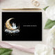 A beautiful white 3D looking white crescent moon with ornate detail on it appears to be glowing brightly against a midnight black background. It is resting on grey fluffy clouds that have vertical dangling diamond string drops hanging from it. The white silhouette of a bride and groom holding hands appears in the curve of the bottom half of the moon and white editable text templates appear to the right of this generative content graphic. This chic and stylish illustration is ideal for a moon and stars, starry night or under \ over the moon event, party or celebration