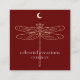 Modern square business card features gold celestial dragonfly with crescent moon illustration on dark red background with white contemporary text on front, and grey text with customizable QR code for your website or social media on back.
