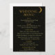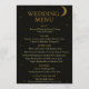 Add elegance to your reception with this celestial black and gold wedding menu, featuring a starry night backdrop with shimmering moon and constellation accents. Designed in refined script and serif fonts, the menu highlights each course from soup and salad to appetizers, main entrées (chicken, beef, fish, and vegan options), dessert, and a signature drink. Perfect for celestial weddings, black-tie events, or evening celebrations, this customizable menu coordinates beautifully with matching invitations, RSVP cards, Save-the-Dates, thank-you notes, and enclosure cards. Printed at 350 DPI on premium cardstock for a luxurious finish.